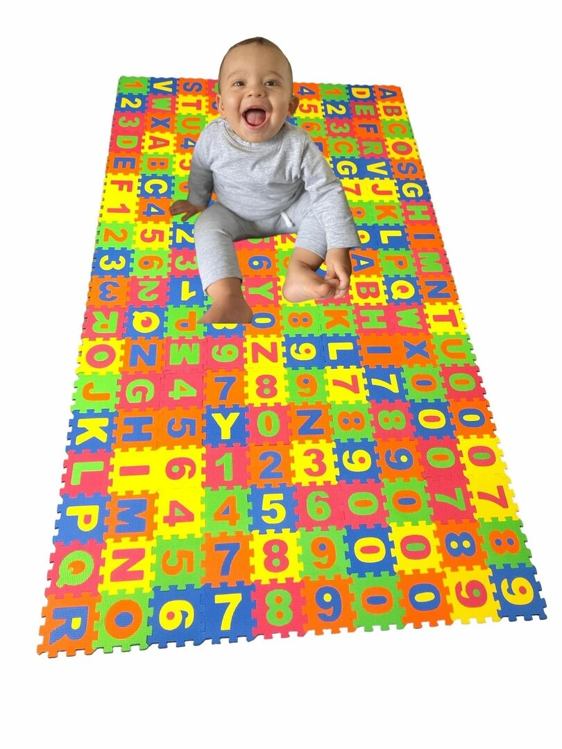 De Speelmat bestaat uit 36 eenvoudig in elkaar te plaatsen puzzelstukken, voorzien van alle letters en cijfers in vrolijke kleuren.