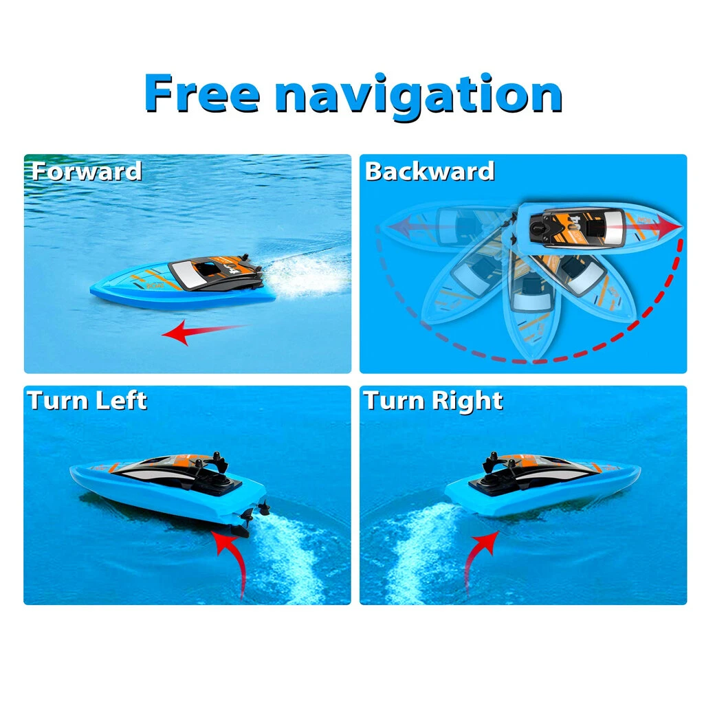 Race tegen meerdere RC-boten zonder interferentie met behulp van de 4-kanaals speedboot-afstandsbediening en de geavanceerde 2.4 G-technologie voor frequentieverbinding maakt afstand mogelijk op afstand tot 50m te varen. De snelheid kan oplopen tot 10 km/u. Deze boot kan ongeveer 20 minuten continu worden gebruikt na dat het volledig is opgeladen.