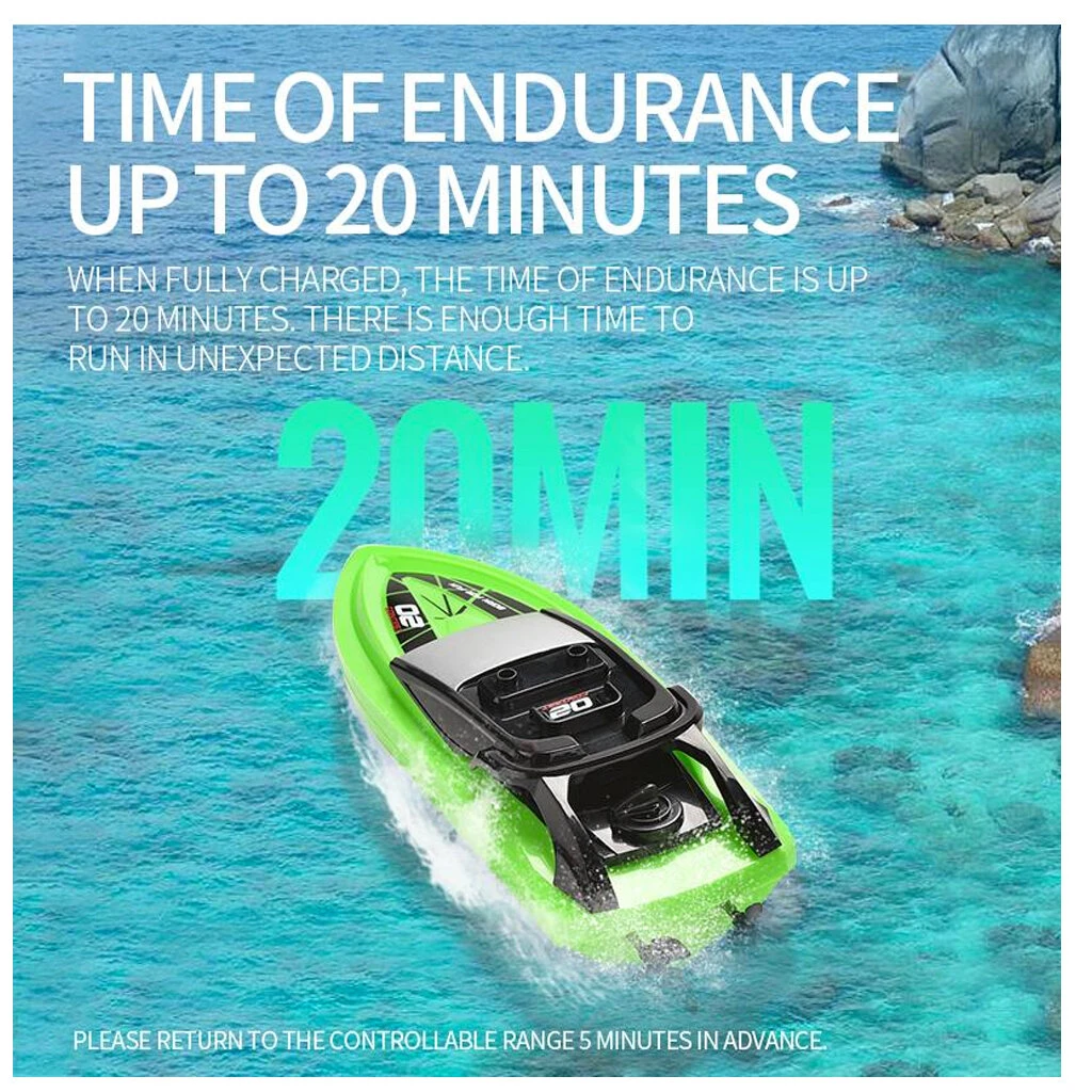 Race tegen meerdere RC-boten zonder interferentie met behulp van de 4-kanaals speedboot-afstandsbediening en de geavanceerde 2.4 G-technologie voor frequentieverbinding maakt afstand mogelijk op afstand tot 50m te varen. De snelheid kan oplopen tot 10 km/u. Deze boot kan ongeveer 20 minuten continu worden gebruikt na dat het volledig is opgeladen.