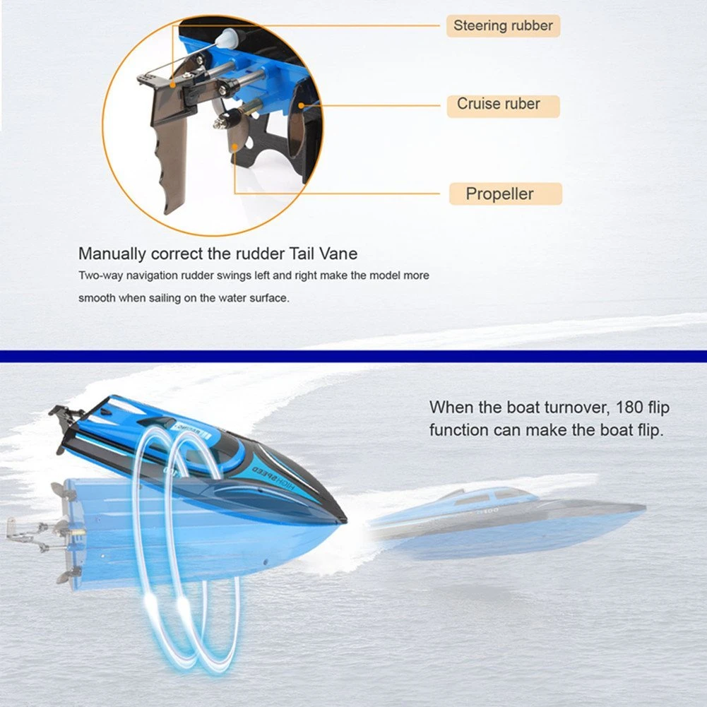 Wilde jij altijd zo een gave snelle race boot? Deze High Speed race boot heeft een vrij stabiele uitvoering en is gemakkelijk te besturen voor zowel kinderen als volwassenen. Zodra het boot op het water kapseist, kan deze met automatisch 180 ° flip funciton weer recht op het water krijgen. Deze functie controleren en zorgen voor een correcte vaarervaring. High Speed boot heeft een snelheid tot wel 20 km/u, en is hierdoor 3 keer sneller dan andere gewone RC boten!