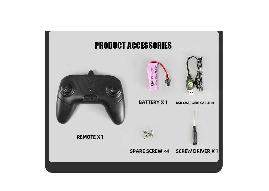 - Inclusief: USB oplaadkabel, Controller, Handleiding, RC Stunt Car, 1x Oplaadbare batterij